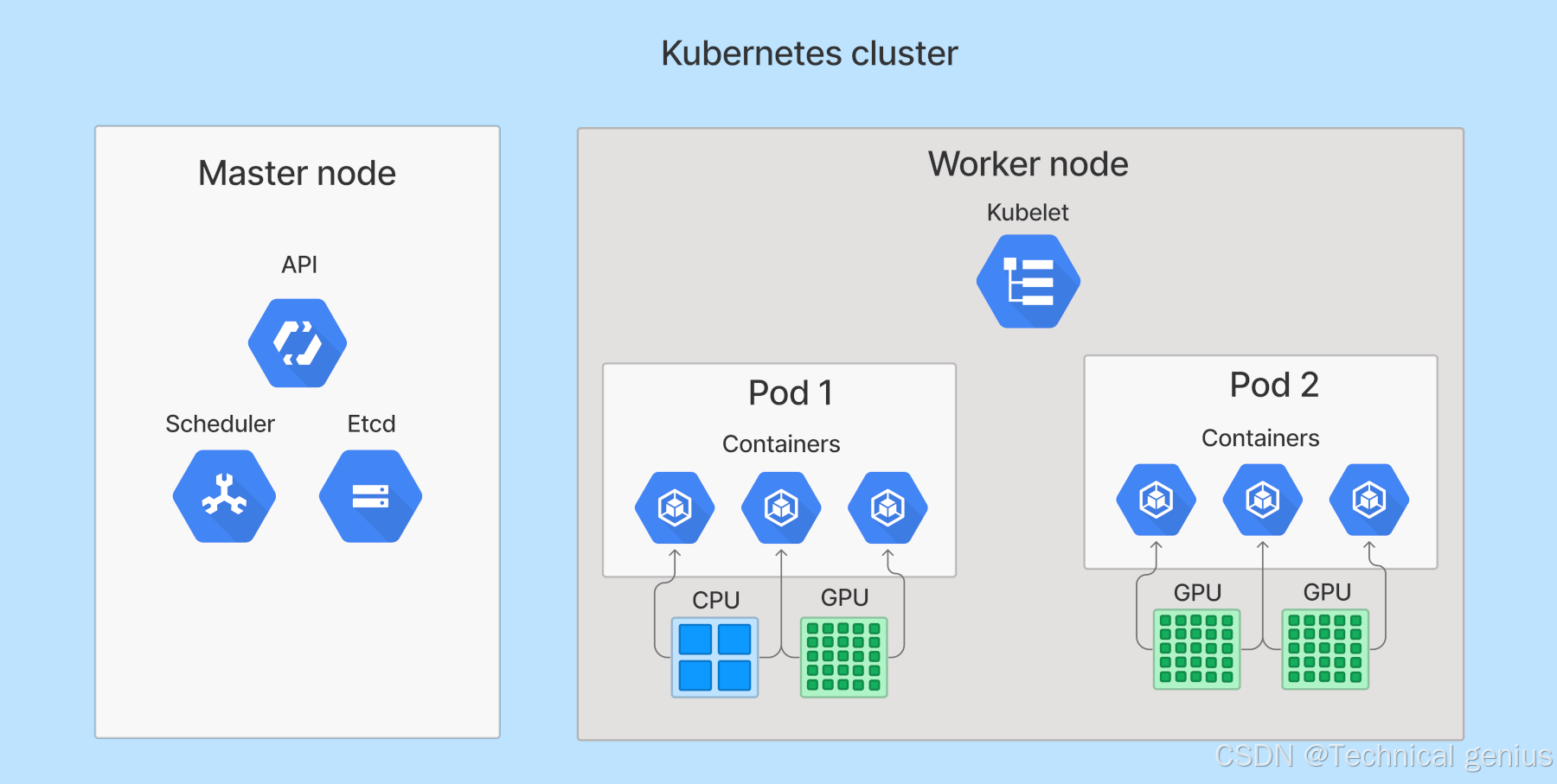- 工作节点(Worker Node):作为“手脚”,执行实际的应用容器。每个节点包含: