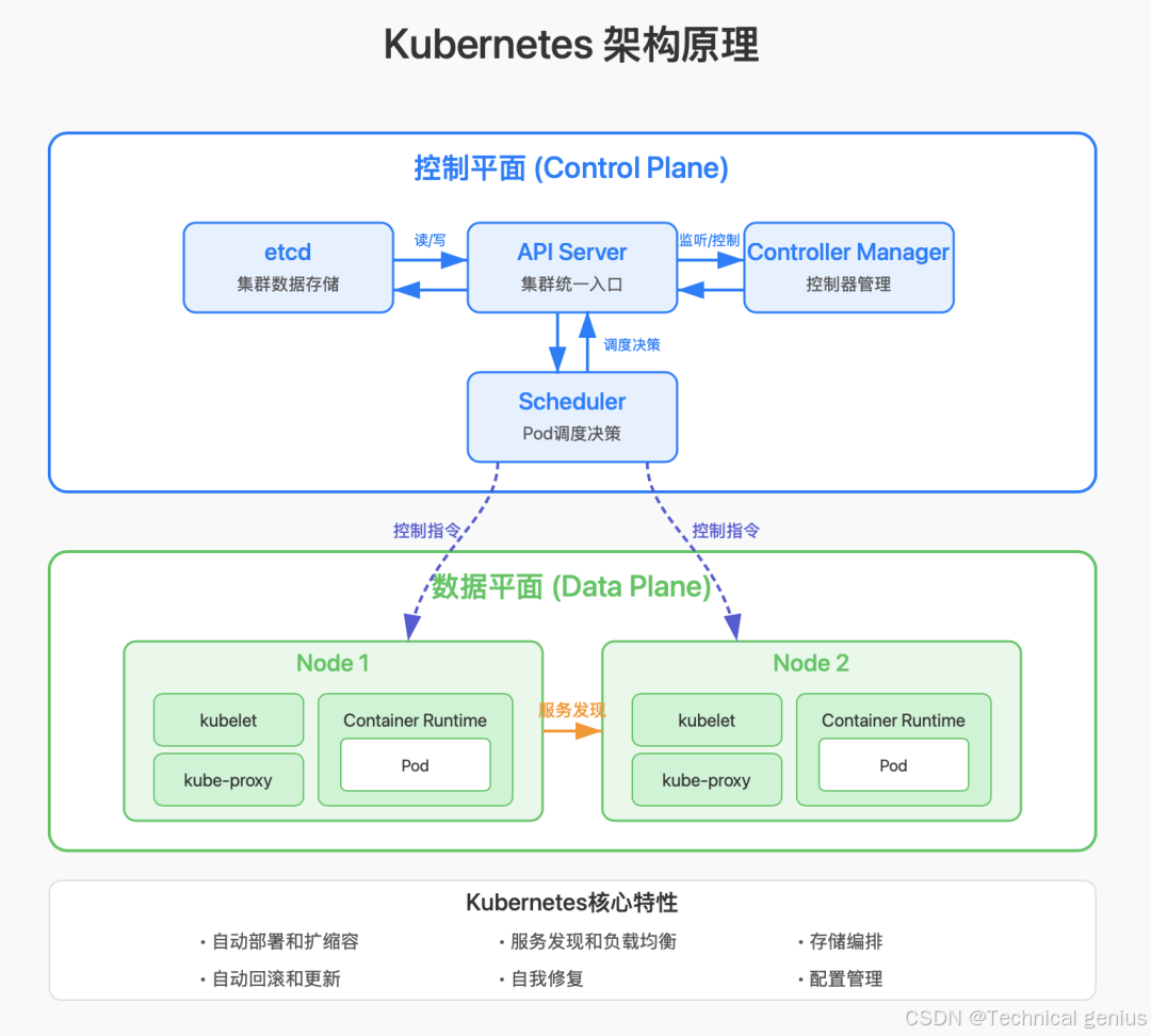 - 控制平面(Master节点):作为集群的“大脑”,负责全局决策和调度。核心组件包括: