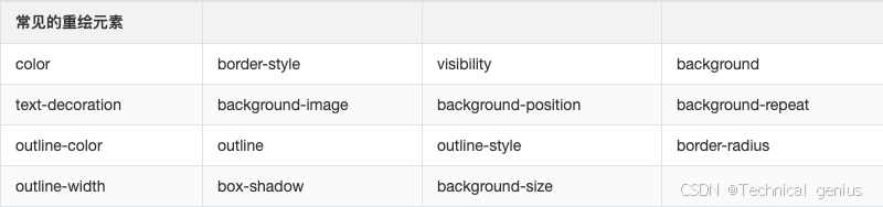 - Repaint(重绘):仅当元素外观(如颜色、背景)改变且不影响布局时触发,浏览器重新绘制元素。