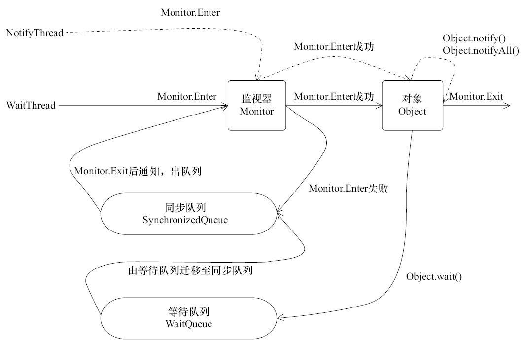 WaitThread首先获取了对象的锁,然后调用对象的wait()方法,从而放弃了锁并进入了对象的等待队列WaitQueue中,进入等待状态。由于WaitThread释放了对象的锁,NotifyThread随后获取了对象的锁,并调用对象的notify()方法,将WaitThread从WaitQueue移到SynchronizedQueue中,此时WaitThread的状态变为阻塞状态。NotifyThread释放了锁之后,WaitThread再次获取到锁并从wait()方法返回继续执行。