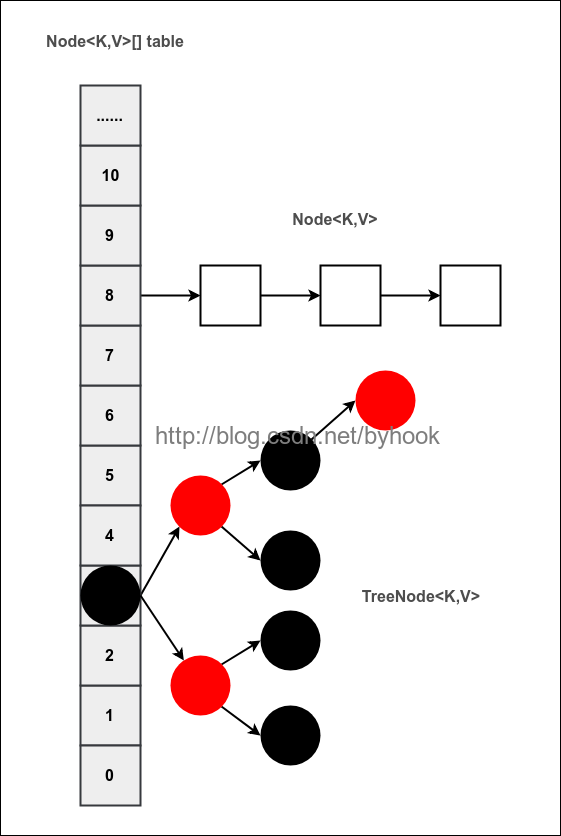 在JDK1.8中多了一个高位运算,桶数组每次扩容都是2的n次方,因为n变为2倍,那么n-1的mask范围在高位多1bit(红色),只需要通过该标识就可以判断索引是否有发生变化,是0的话索引没变,是1的话索引变成"原位置+oldCap"