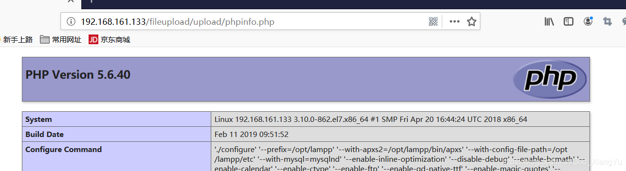 根据页面返回的路径,尝试执行phpinfo.php: 输入url:192.168.161.133/fileupload/upload/phpinfo.php :