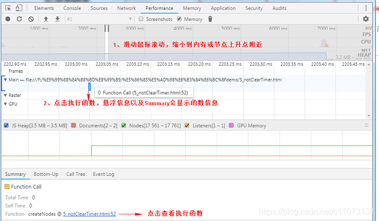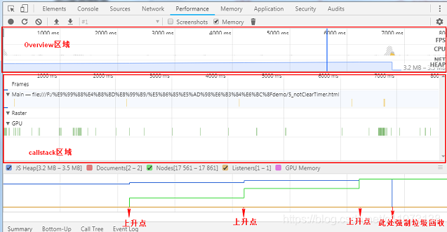 点击添加节点,再点击删除节点,作为一轮操作。通过chrome JS堆动态分配时间轴可以看到每轮操作后,都有JS堆内存得不到释放。