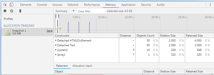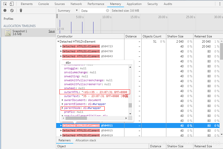 点击选中Detached HTMLDivElement,可以查看这些节点被哪个JS变量引用。从下图中可以看出分离节点是被window.elements数组间接引用: