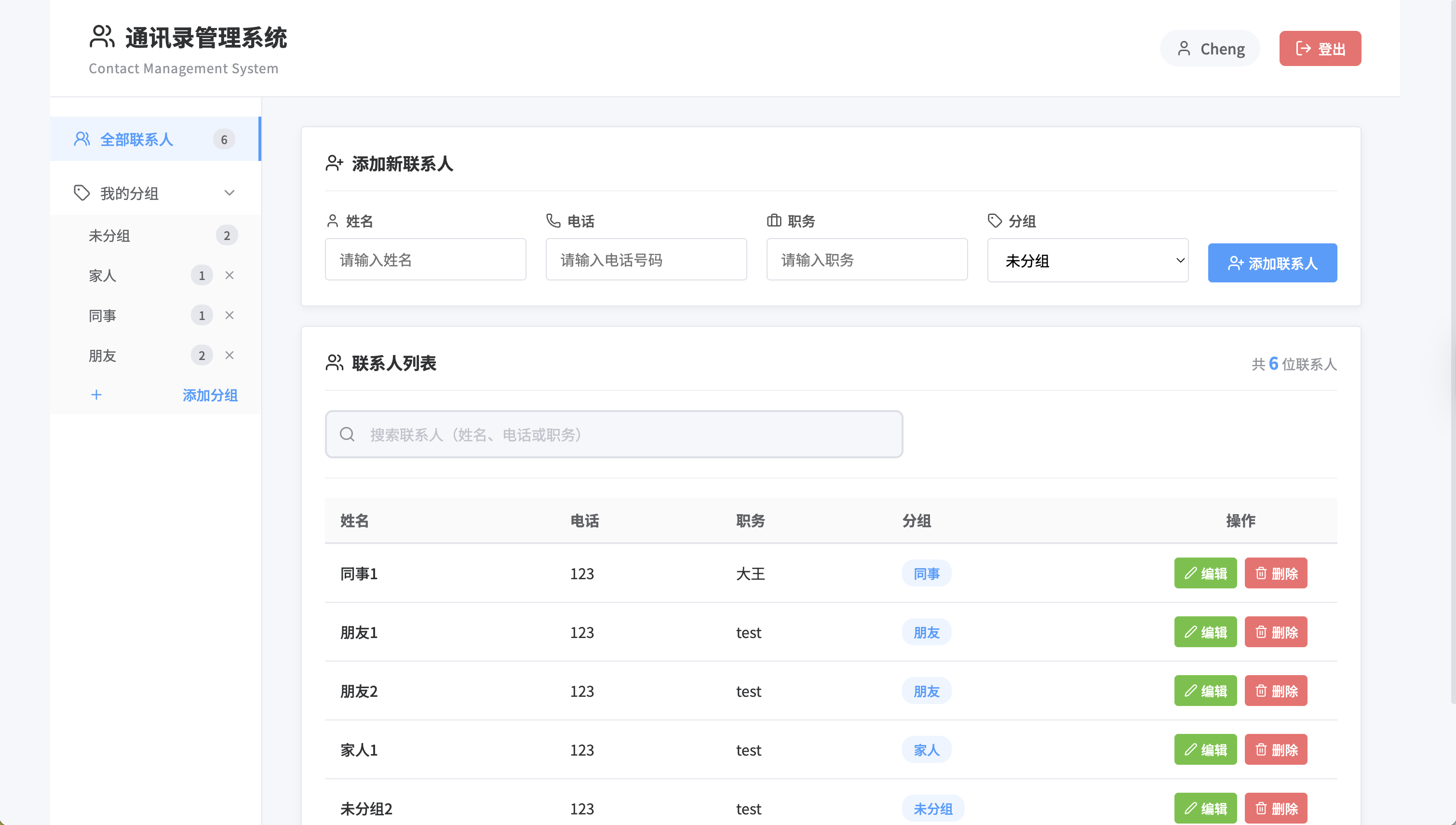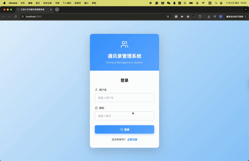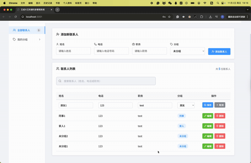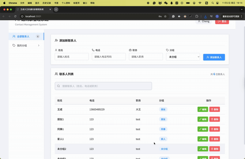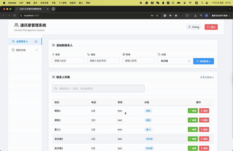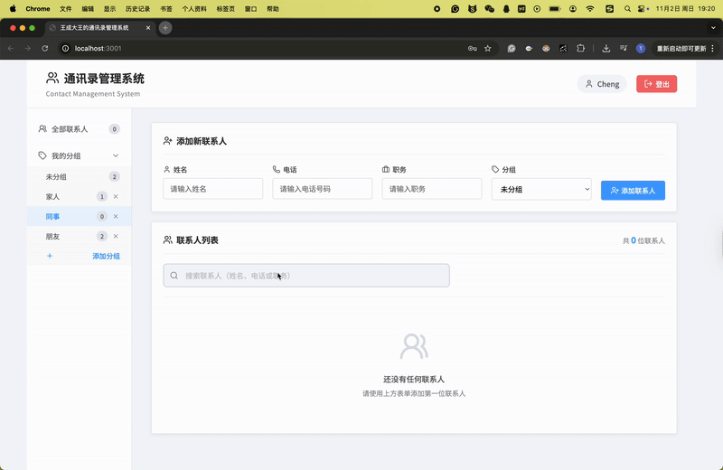 最后,集成前后端是整个项目的关键,我也收获最多。我使用axios从前端发送HTTP请求到后端API,例如在添加联系人时传递数据并更新列表。过程中,遇到了CORS跨域和会话管理的问题,我通过网络搜索和逐步调试来解决,这培养了我问题排查的能力。项目最终运行顺利时,看到联系人能被搜索、编辑和分组管理,我感到很激动。
