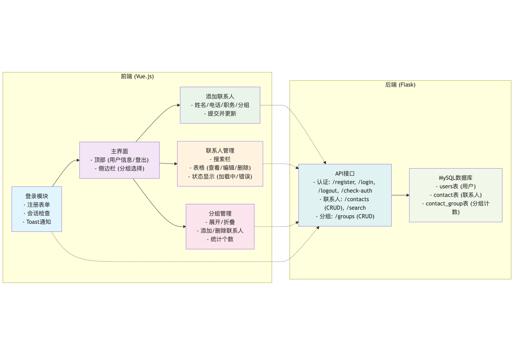首先,我决定进行后端Flask的开发。这一部分一开始比较困难,因为我缺乏后端经验。但我从简单API入手,先定义了登录和注册的端点,使用`@app.route`来路由请求,并通过`generate_password_hash`处理密码加密,这让我理解了数据安全的必要性。然后,我学习了MySQL数据库的操作。创建表结构(如users、contact和contact_group表)和执行查询语句时,最初遇到了一些语法错误,但通过反复测试PyMySQL连接,我成功插入了第一条联系人数据。分组功能的实现例如使用JOIN查询来计算分组计数进一步加深了我对表的理解。通过Postman测试API端点,我逐步验证了后端功能,确保后端功能完整。