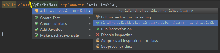 2. 将光标移动类名前,按住Alt+enter,选择fix all..即可生成suid
