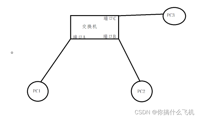 PC1 传输数据到PC2: pc1创建类似信封的数据包,内部存储所需传输的数据, 信封表面填写有: 发送者PC1Mac地址; 收件者PC3Mac地址, 交换机收到PC1的数据包后会记录端口A所连接的PC1的Mac地址到交换机的Mac表上, 并识别数据包所填写的收件者Mac地址, 若Mac表中未记录收件者Mac地址则会通过洪泛将数据包转发到处A以外所有端口, PC2收到数据包文件 会核实不是自己的Mac地址, 将数据包丢弃 。PC3收到数据包文件核实为是自己的Mac地址,会读取数据,同时,交换机会记录PC3的Mac地址以及所对应的端口号。