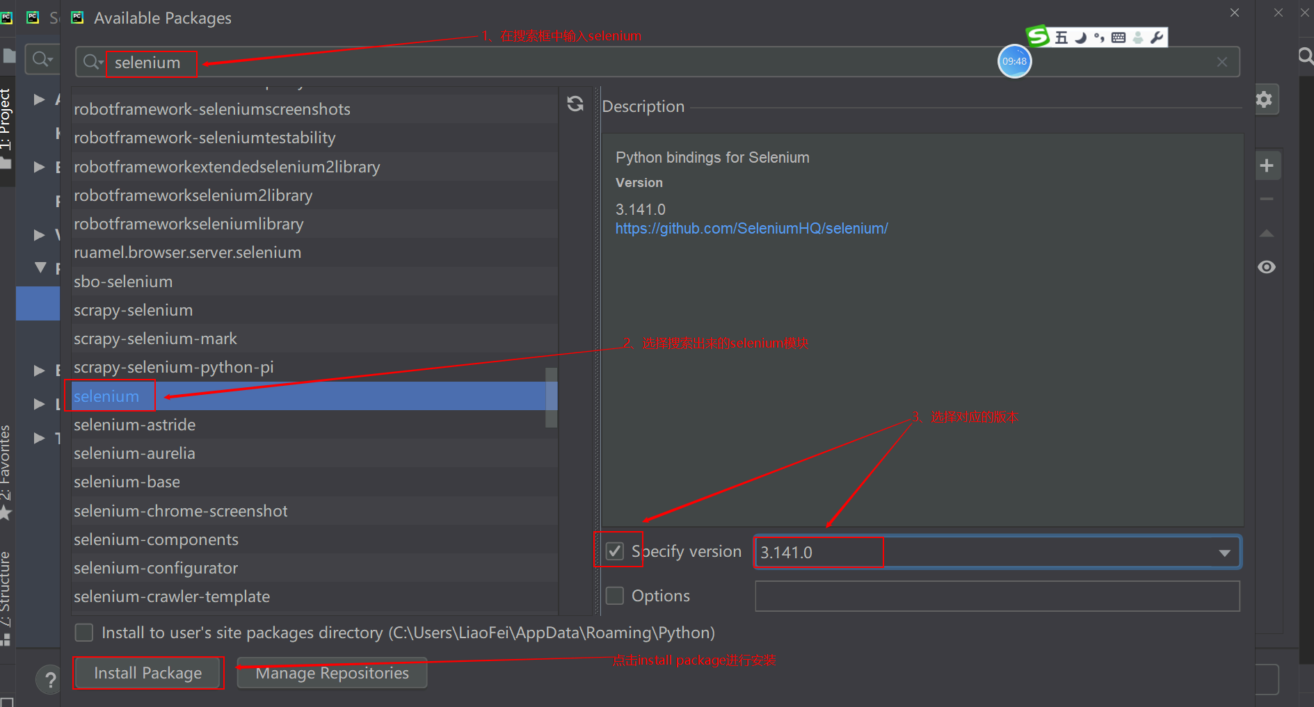 - 在线安装方式:在dos命令行中输入:pip install selenium