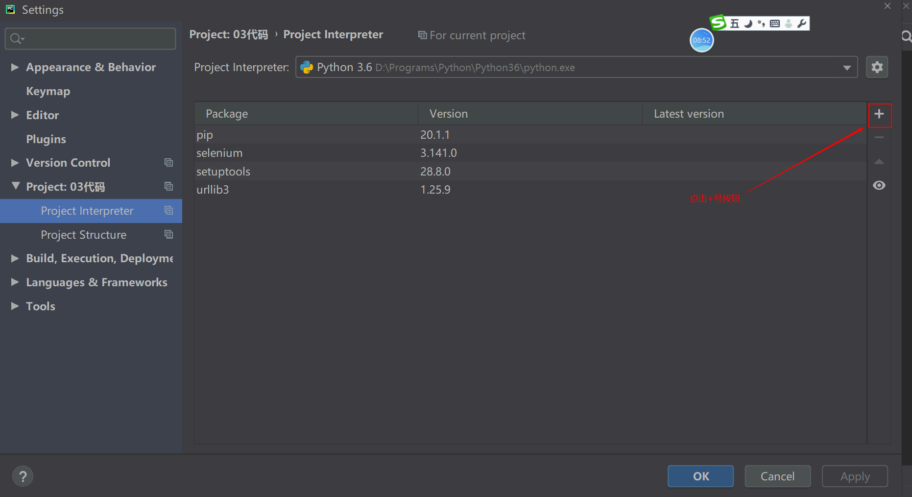 - 在file(文件)菜单中选择setting(设置),然后选择“projecr-interpreter”