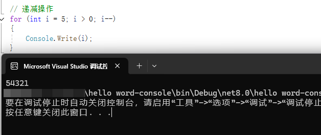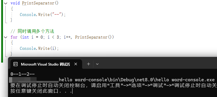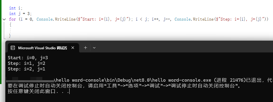 for (i = 0, Console.WriteLine($"Start: i={i}, j={j}"); i < j; i++, j--, Console.WriteLine($"Step: i={i}, j={j}"))
