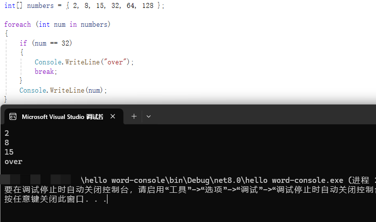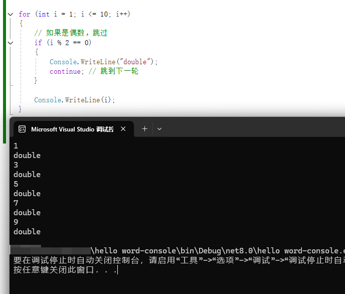 在迭代语句正文中的任何时间点,可以使用该break语句中断循环。 可以使用continue语句跳至循环中的下一次迭代。