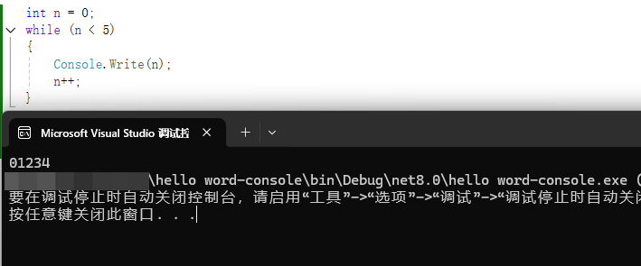 0 < 5为真 → 执行循环体:输出0→n变为1 - 检查条件