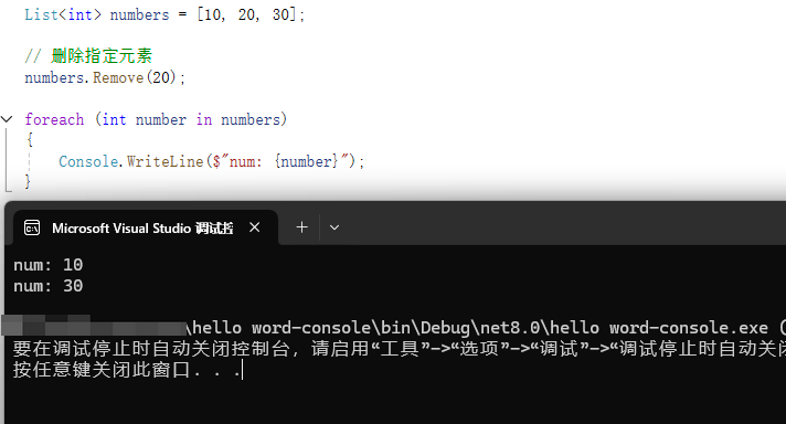 numbers.RemoveAt(0);//删除后变成[20, 30]