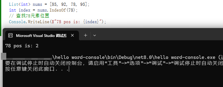 Console.WriteLine($"78 pos is: {index}");