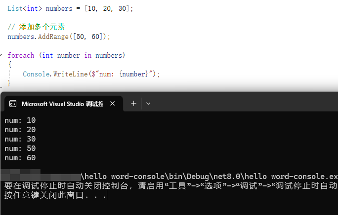 numbers.InsertRange(1, [50, 60]);//插入后[10, 50, 60, 20, 30]