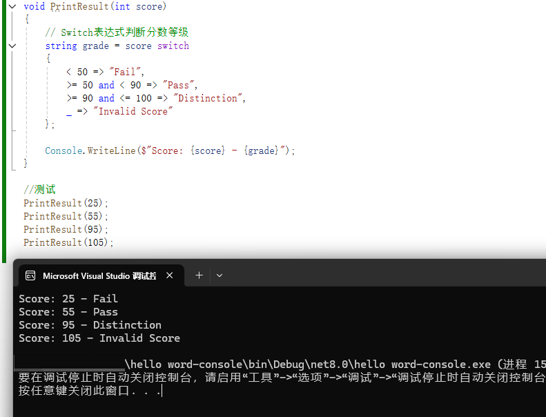 // Switch表达式判断分数等级