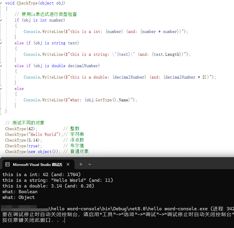 “is 表达式”支持通过模式匹配来测试表达式,并根据测试结果有条件地声明一个新的变量。
