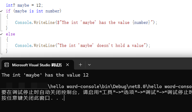 Console.WriteLine("The int 'maybe' doesn't hold a value");