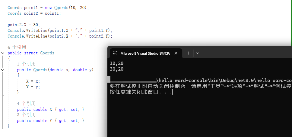 Console.WriteLine(point2.X + "," + point2.Y); // 输出: (30, 20) -> 只有 point2 变了