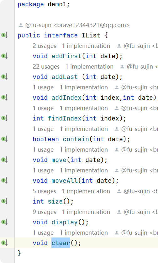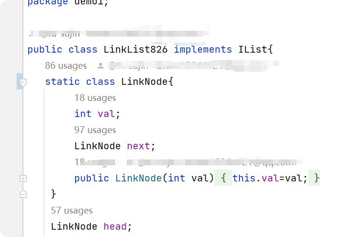我们想要创建一个单链表,首先,想单链表是由什么组成的,一个一个的结点,那么这些结点通过什么来连接?结点中存储的下一个结点地址,再想我们如何查找遍历这个链表,这个时候就涉及到了,表头也就是头结点,为了实现一些处理数据有关操作在Java代码中我们可以一个链表看为一个类,结点作为内部类,链表既然是一种存储结构为数据而生,而我们阿猿在处理数据时,必须要和它的存储结构打交道,借存储结构实现处理数据的一些基本操作:增、删、改、查,这些操作被封装在不同的方法里,鉴于存储结构会常用到这些方法,为方便后续编写其它的存储结构,我可以这些方法于接口中声明,方便下次编写与后期维护。接下来以无头单链表为例,其接口定义如图: