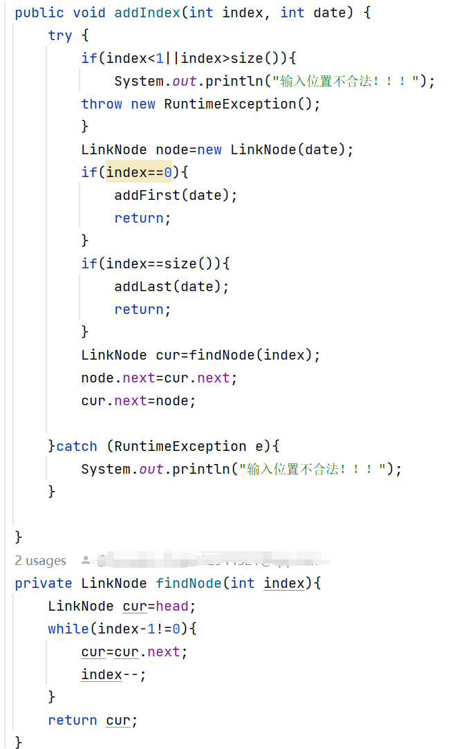 7.根据输入值和下标插入的函数,思路:首先判断输入位置是否合法,合法之后若位置为0,则头插,位置等于链表长度则选择尾插,若位置都不满足上面条件,则利用根据位置找前一个节点的函数【其思路创造也是头节点引用2利用循环,循环条件是下标-1不为0,引用指向下一个节点的引用,直到找到目标位置的前一个节点返回此节点】。把新节点引用的next指向返回节点的引用的next【放在前防止返回节点的next被覆盖】之后再把返回节点的引用的next指向新节点即可。如图: