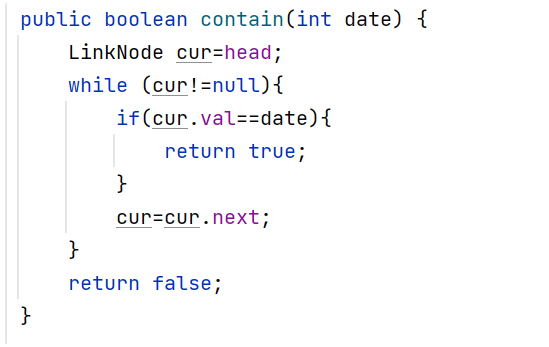 3.判断链表是否包含某个值,思路:本质也是遍历链表,头结点的另一个引用随循环后移找到目标值返回true否则继续遍历,直到最后一个节点,还是没找到就返回false。如图: