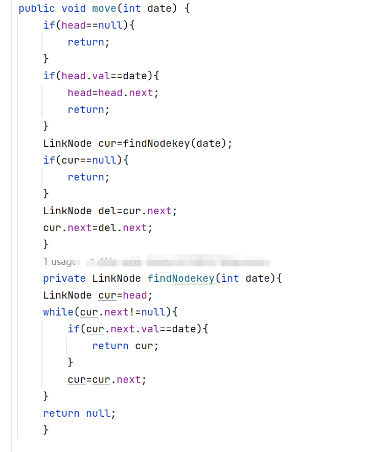 9.删除一个值,思路:先判断表是否为空,若不为空,又判断传入值与头节点的值是否相同,若相同,把头节点的引用后移一个,返回即可,若不一样,则把值传入据值找前一个节点的函数【其思路为新建头节点的第二个引用,利用循环遍历停止条件是节点的next为空,若找到存此值的前一个节点则返回,否则继续往后走】得到存此值的前一个节点于是我们把前一个节点的next改为它的后一个节点的next即可。如图: