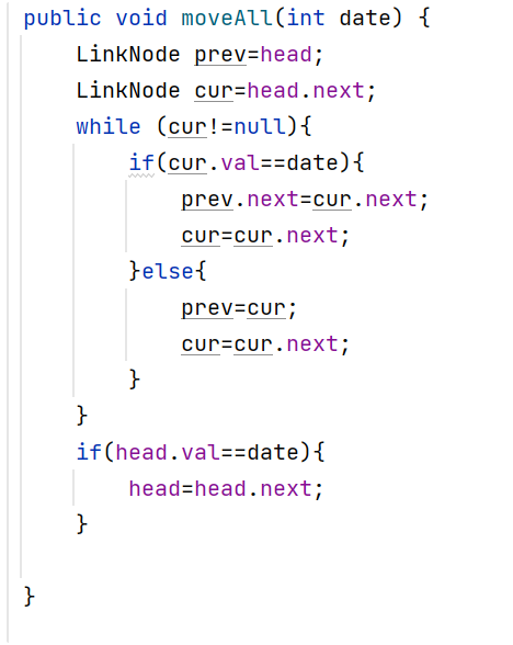 10.删除链表中与传入值相同的所有相同值,思路:新建头节点引用prev、第二个节点的引用cur,新建两个引用变量便于修改目标节点的前一个节点后一个节点。既然是要找所有值,那肯定需要循环遍历全表,循环条件为cur不为空,在循环中采用if-else语句,if判断条件是找到cur的值等于目标值后,把prev的next指向cur的next,并把cur指向其原本的下一个节点返回,如果没找到目标值,则prev和cur同时往后走一步,直到找到为止。如图: