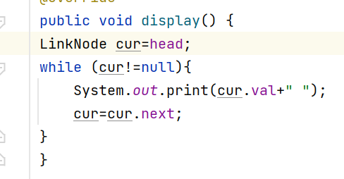 1.打印链表,思路:打印链表得先找到头,然后挨个挨个打印吧,所以首先你要获得头节点,那么之后呢?打印过程中要遍历链表,头节点不可随意变动,所以得用同类型的引用变量存头节点的引用,之后在循环中一步步往后走,直到节点为null时停下,此时已经走完所有的节点。如图: