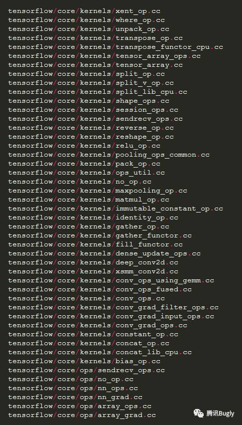 其实在解决前面遇到的那个 crash 问题的时候,已经指明了一种裁剪的思路,既然 mobile 版的 TensorFlow 本来就是 PC 版的一个子集,那就意味着可以根据具体的需求,让这个子集变得更小,这也就达到了裁剪的目的。具体来说,就是修改 TensorFlow 源码中的 tensorflow/tensorflow/contrib/makefile/tf_op_files.txt 文件,只保留使用到了的模块。针对 HED 网络,原有的 200 多个模块裁剪到只剩 46 个,裁剪过后的 tf_op_files.txt 文件如下: