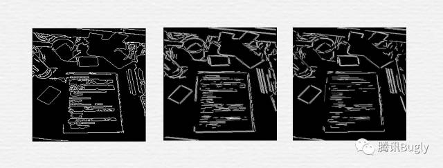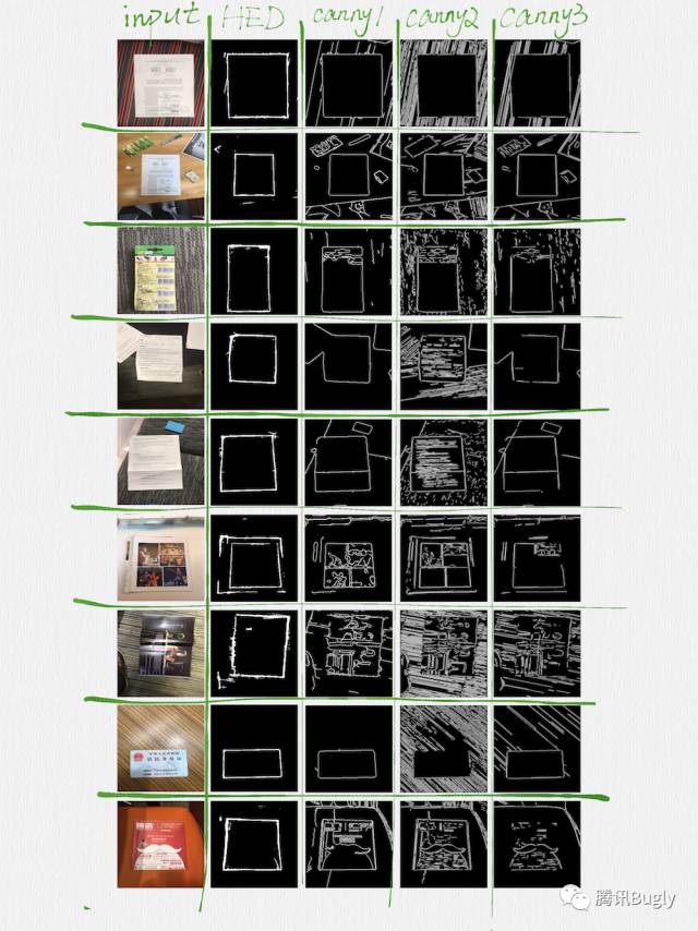 这张图表的第一列是输入的 image,最后的三列(先不用看这张图表的第二列),是用三组不同阀值参数调用 canny 函数和额外的函数后得到的输出 image,可以看到,边缘检测的效果,并不总是很理想的,有些场景中,矩形的边,出现了很严重的断裂,有些边,甚至被完全擦除掉了,而另一些场景中,又会检测出很多干扰性质的长短边。可想而知,想用一个数学模型,适应这么不规则的边缘图,会是多么困难的一件事情。