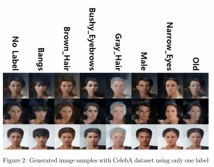 CGAN还具有另一优势:相较于条件GAN,CGAN可以生成label-focused样本。通过选择γ的低值,可以讲发生器更多的专注于输入标签。图4是CGAN,γ=5和条件GAN的对比。从图中可以看出CGAN生成的人脸图片比条件GAN更契合输入标签。例如,使用“Arched Eyebrow”标签时,CGAN生成的图片全部符合这个标签的特征,而条件GAN则有偏差。