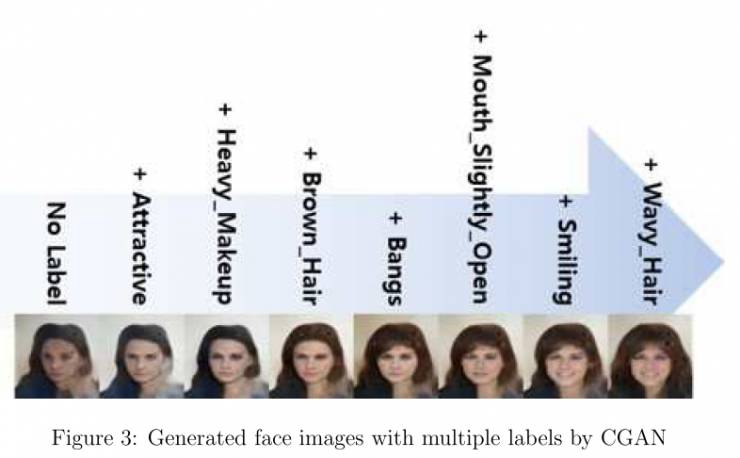 通过想发生器输入多个标签,CGAN可以生成多标签样本。CelebA数据库由多个标签的图片构成。例如,一个样本图片可以有“Attractive”,“Blond Hair”,“Mouth Slightly Open”和“Smiling”的标签。