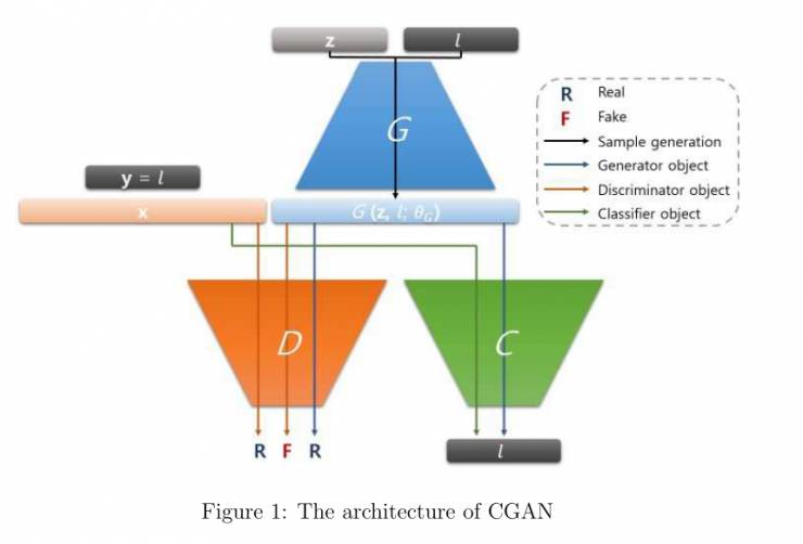 CGAN由三种神经网络结构组成,发生器/解码器,鉴别器和分类器/编码器。图1中描述了这种CGAN的架构。这三种结构相互协作,发生器尝试欺骗鉴别器,这与vanilla GAN相同,并且旨在正确的被分类器进行分类。发生器和分类器也可以理解为解码器-编译器的结构,原因是标签是发生器的输入同时是分类器的输出。