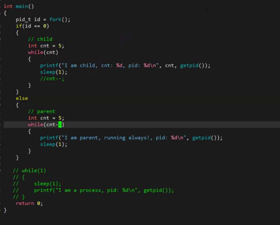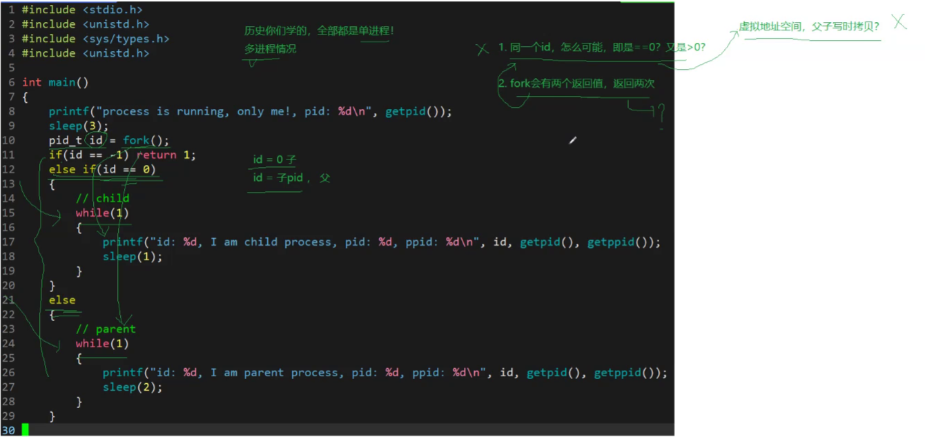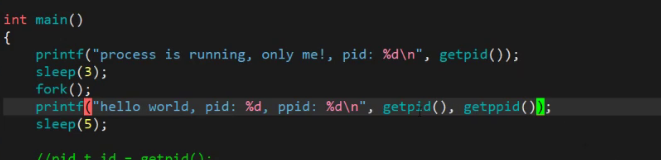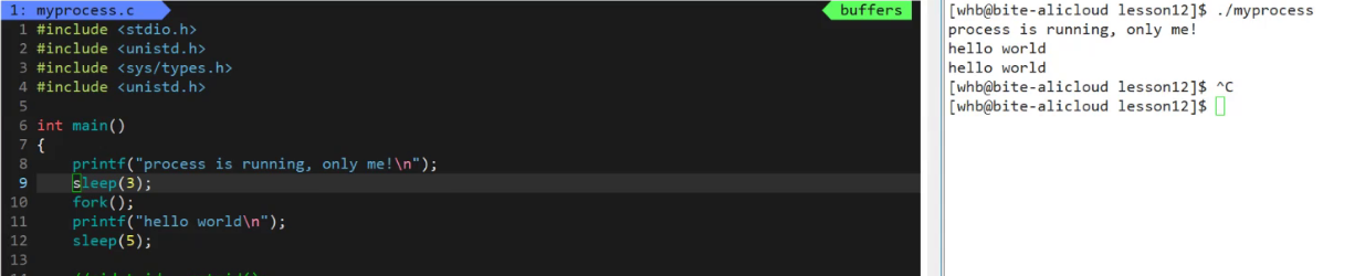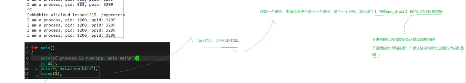 父进程和子进程共享代码和数据。这是hello world 为什么会被打印两次的原因(父,子进程各自执行一次)。