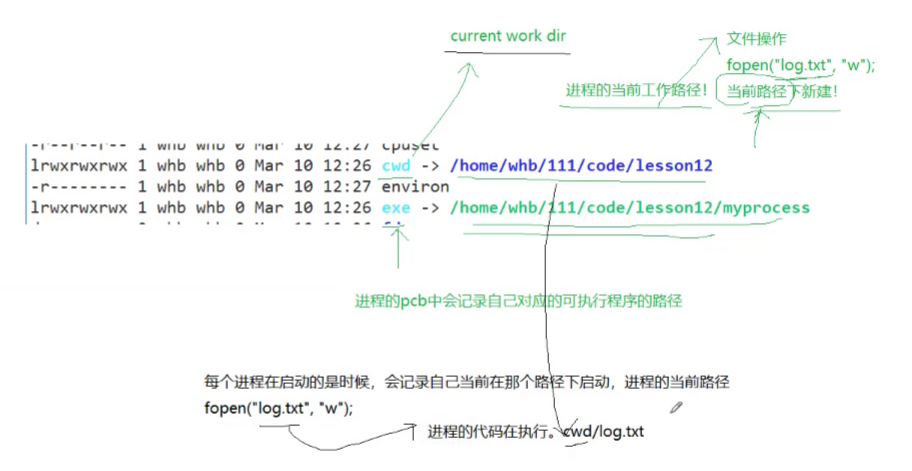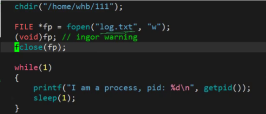 chdir:修改进程的工作路径,修改之后,log.txt就创建在了修改之后的路径下,而不在可执行程序的路径下!