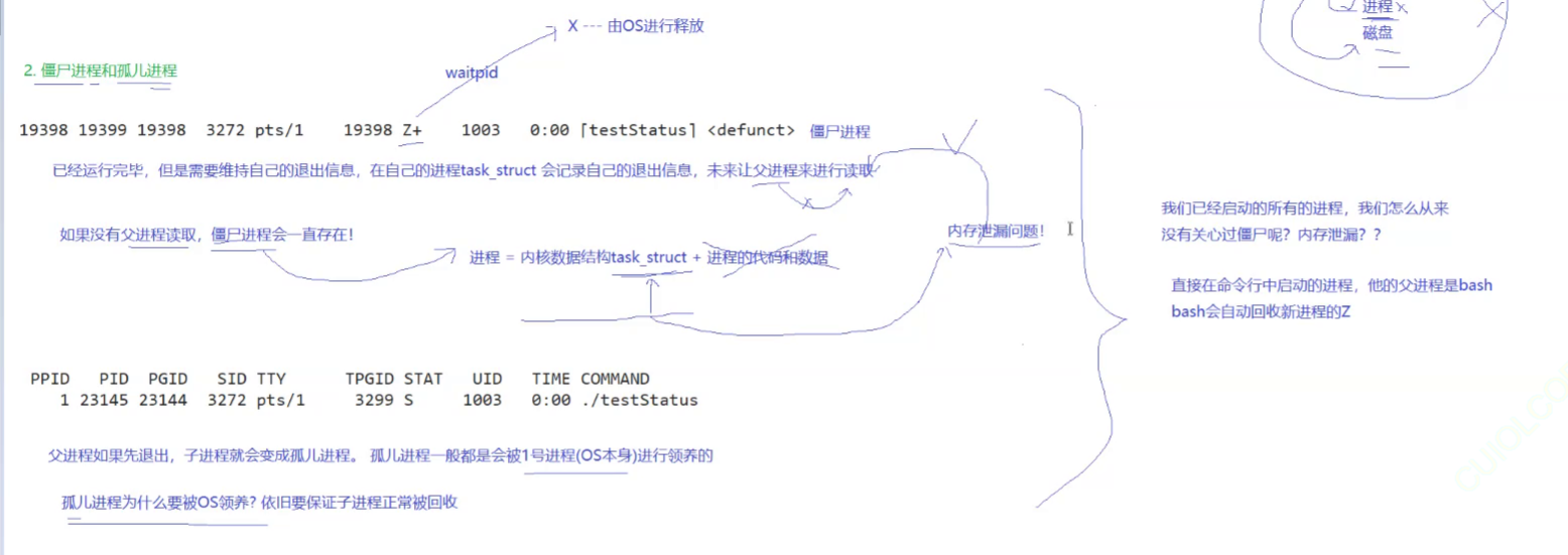 以后用waitpid对子进程的数据进行读取,子进程会从z状态进入x状态,然后由OS进行释放。