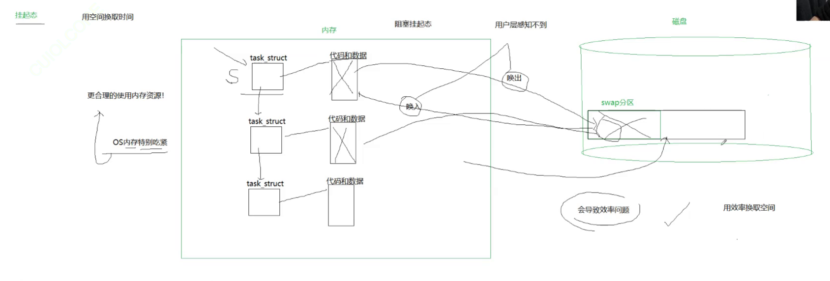 有进程处于阻塞状态且OS内存十分吃紧,OS会将阻塞的进程的数据和代码转移带swap分区。此时,被转移的进程处于阻塞挂起状态。这是以时间换空间的做法。