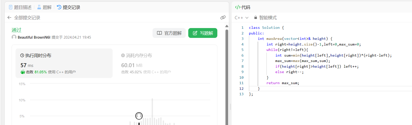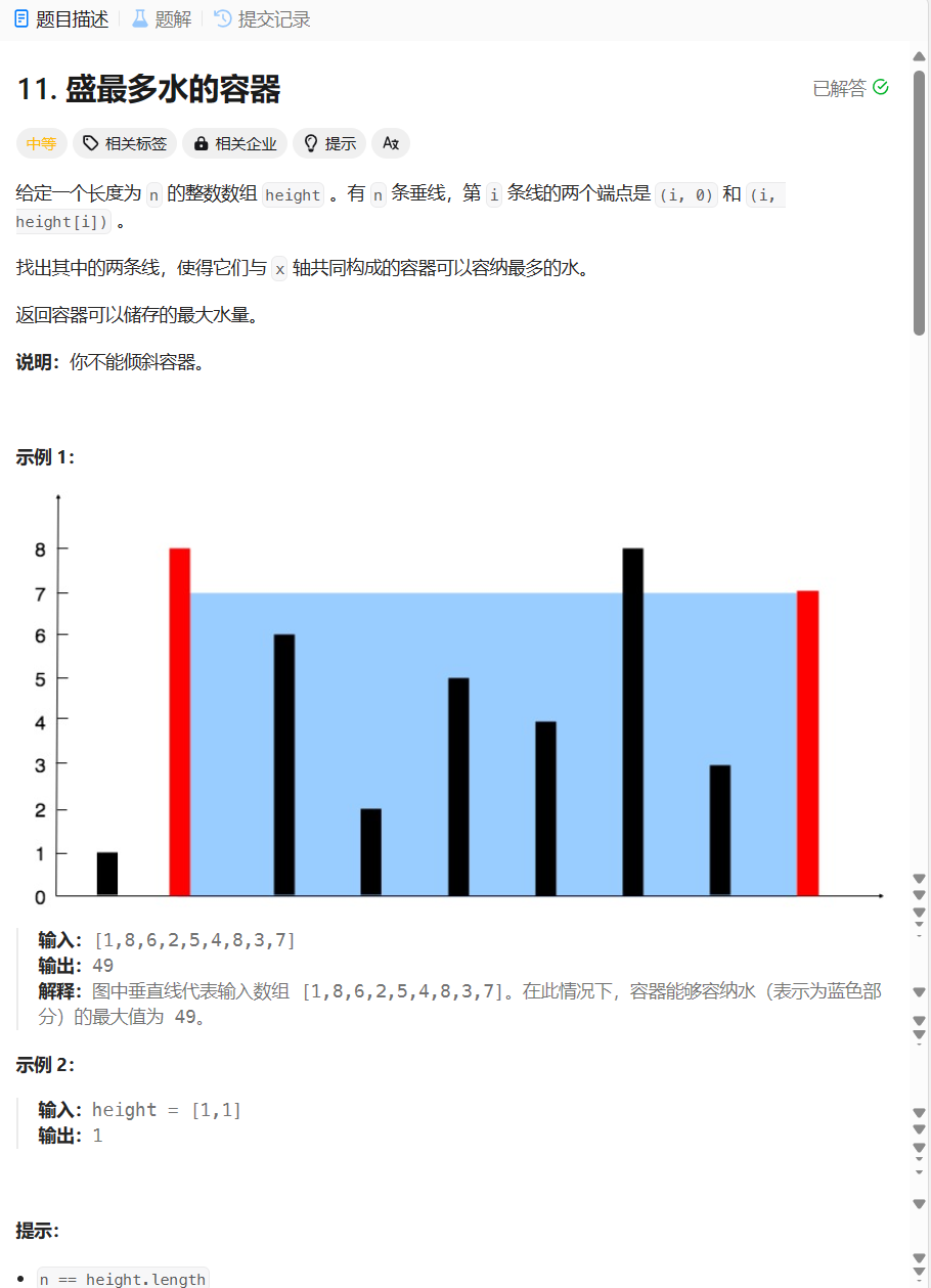 例如数组{2,3,8,1,7,6}。2和6之间的距离=2*5。根据体积的计算特点,对于2来说,它和其他数字之间的体积一定小于2和6之间的体积,所以这些情况就可以直接舍掉,最大体积一定在{3,8,1,7,6}中产生。同样的道理,3和6之间的体积为3*4。对于3来说,它和其他数之间的体积一定小于3和6之间的体积,然后这些情况可以舍掉,只用考虑{8,1,7,6}。这样循环往复,最后的最大值一定在计算出来的体积中产生。