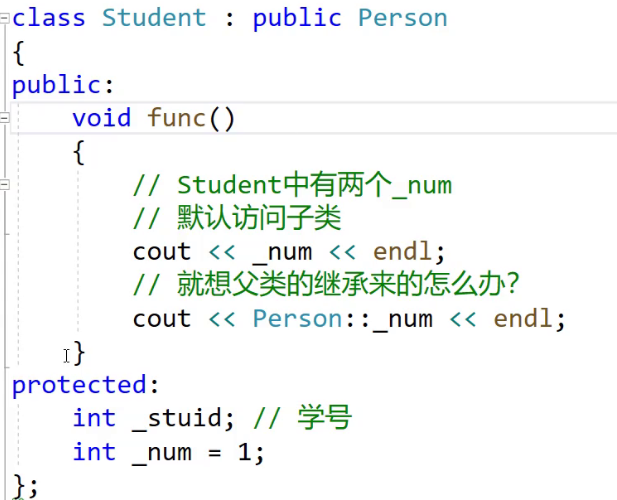 基类和派生类可以有同名的成员变量,在访问时遵循“就近原则”。在派生类访问时,默认访问派生类的,如果想访问基类的,需要域作用限定符。