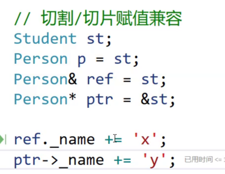 因为基类的对象的成员变量派生类中都有,所以在赋值时,相当于在把派生类中含有基类成员变量的部分进行切片然后赋值给基类。传指针时,基类的指针同样指向该切片的空间。所以在传引用和指针后,对基类的成员变量修改,会让派生类对应的成员变量发生改变。