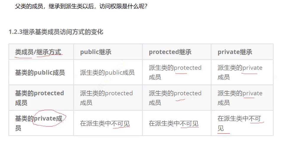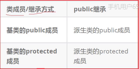 1.先看这个表格的最后一行,只要在基类中是私有成员,不论哪种继承方式,在派生类中均不可见。这里的不可见不是说真的不可见,而是在派生类外边和里边不可以直接访问,但是派生类可以通过基类中公有成员函数访问。(注意,不论是成员函数还是成员变量都是成员,如果它们是私有,都不能直接在类外面访问,只能通过其他公有的成员函数访问)。