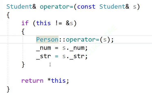 派生类调用赋值时(编译器默认生成的),对于内置类型直接赋值,对于自定义类型(包括基类)回去调用它们的赋值。