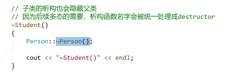 派生类的析构会隐藏基类的析构,需要基类的访问限定符才能访问到基类的析构。