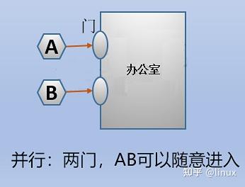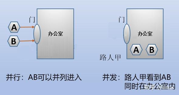 老师让两个同学去办公室谈话。如果这两同学(进程)是并列跨过办公室门(CPU)的,那么就是并行。如果同学A先进同学B后进入(或者先B后A),或者两人并列同时进入,但是在办公室外的路人甲(用户)看来,同学A和同学B同时都在办公室内,这是并发。