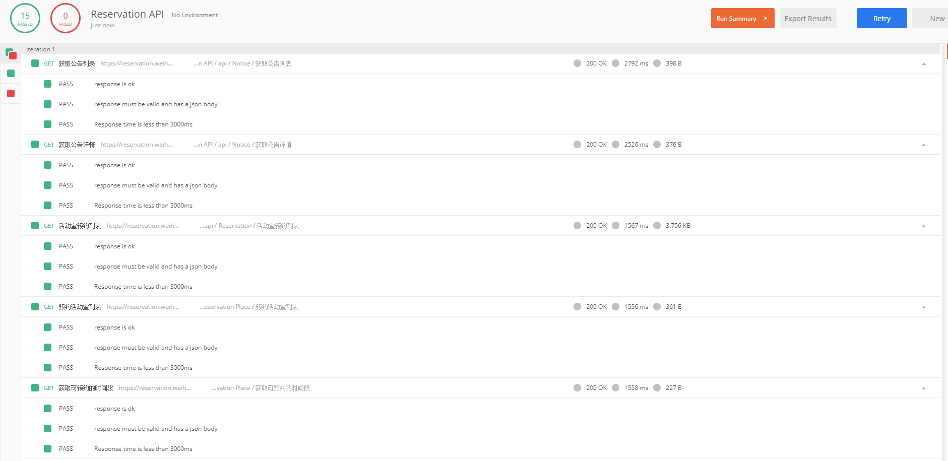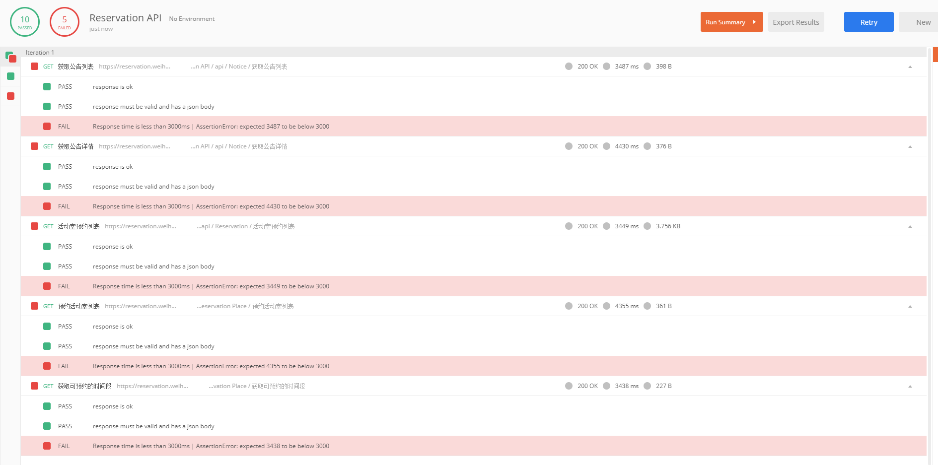 测试结果会显示出多个测试通过,多少失败的,哪些 assertion 失败,你也可以看到具体的响应信息