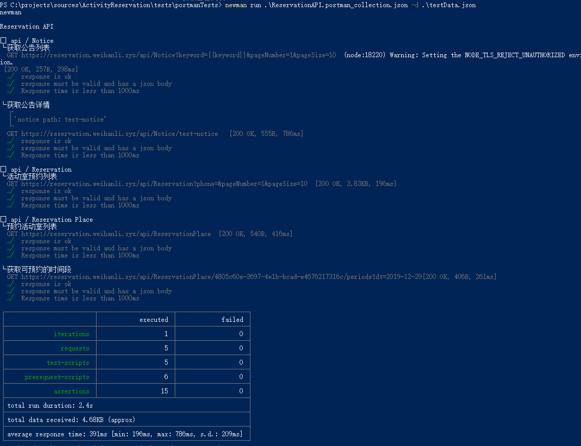 newman run testCollection.json // 运行 testCollection 测试 newman run testCollection.json -d testData.json // -d 指定数据文件 newman run testCollection.json -d testData.json -r json // -d 指定数据文件,-r 指定 report 类型,默认是 `cli` 直接在命令行中输出测试结果 newman run testCollection.json -r cli,json // -d 指定数据文件,-r 指定 report 类型,默认是 `cli` 直接在命令行中输出测试结果,可以指定多个 reporter,json 会将运行结果保存到 json 文件中 // collection 路径不仅支持本地路径,也支持 url newman run https://www.getpostman.com/collections/631643-f695cab7-6878-eb55-7943-ad88e1ccfd65-JsLv