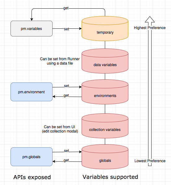 // Variables // This function searches for the variable across globals and the active environment. var value = pm.variables.get("variable_key"); // 这个方法会从上面所有的来源寻找对应的变量,就近原则,优先从最靠近自己的地方找 // Globals // Set a global variable,设置一个全局变量 pm.globals.set("variable_key", "variable_value"); // Get a global variable,从全局变量中获取某个变量的值 pm.globals.get("variable_key"); // Clear a global variable,取消设置全局变量,移除变量 pm.globals.unset("variable_key"); // Environments // Setting an environment variable, 设置一个环境变量(注,这是postman 中的 <Environment> 环境变量,不同于系统环境变量) pm.environment.set("variable_key", "variable_value"); // 你也可以序列化一个对象或数组放在变量中 // Setting a nested object as an environment variable // var array = [1, 2, 3, 4]; // pm.environment.set("array", JSON.stringify(array, null, 2)); // var obj = { a: [1, 2, 3, 4], b: { c: 'val' } }; // pm.environment.set("obj", JSON.stringify(obj)); // Getting an environment variable,从环境中获取某个变量 var value = pm.environment.get("variable_key"); // If the value is a stringified JSON: // These statements should be wrapped in a try-catch block if the data is coming from an unknown source. var array = JSON.parse(pm.environment.get("array")); var obj = JSON.parse(pm.environment.get("obj")); // // Clear an environment variable, 从环境中移除某一个变量 // pm.environment.unset("variable_key"); // Collection // Setting an collection variable,设置一个 collection 变量 pm.collectionVariables.set("variable_key", "variableValue"); // Get a collection variable,从 collection 中获取一个变量 var val = pm.collectionVariables.get("variable_key"); // Clear a collection variable,从 collection 中移除一个变量 pm.collectionVariables.unset("variable_key"); // local pm.variables.set("variable_key", "variable_value"); pm.variables.get("variable_key");